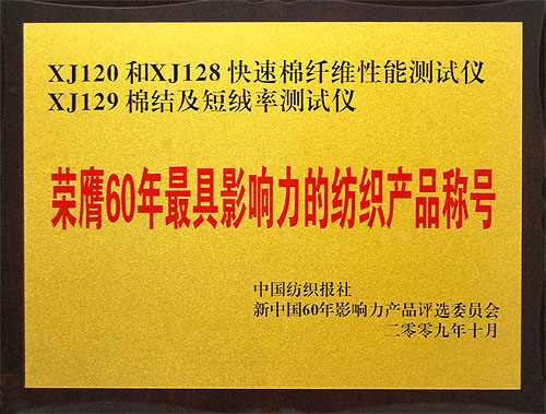 近日,在《中國(guó)紡織報(bào)》舉辦的“建國(guó)60周年最具影響力的紡織產(chǎn)品”評(píng)選活動(dòng)中,我公司XJ120棉纖維性能測(cè)試儀、XJ128棉纖維性能測(cè)試儀、XJ129棉結(jié)和短絨測(cè)試儀三項(xiàng)產(chǎn)品榮獲“60年最具影響力的紡織產(chǎn)品稱號(hào)”。