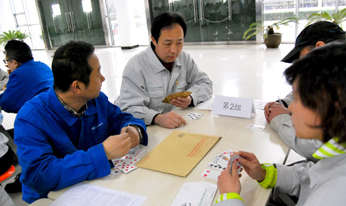 正月十四,一場久違的瑞雪帶來了節(jié)日的喜慶與祝福。紡電公司根據(jù)電氣公司的鬧元宵活動(dòng)安排,動(dòng)靜結(jié)合,在職工餐廳舉行了“智力撲克比賽”。本次比賽由8個(gè)分會(huì)9個(gè)參賽隊(duì)108人參賽,為了使本次比賽公平公正也更能體現(xiàn)參賽者的技術(shù)水平,組委會(huì)借鑒其他賽事,制定了新的比賽規(guī)則,要求每1桌分別使用相同的27付牌型,且東南西北四個(gè)方向位置不變,經(jīng)過2個(gè)多小時(shí)的激烈比賽,紡研所、織機(jī)制造部、紡電制造部分獲團(tuán)體前三名,陳玉國、徐立、常寧、楊萌獲四大最佳牌手。