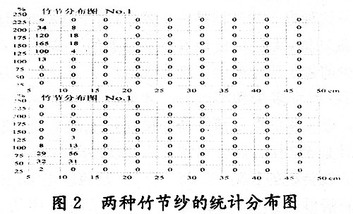 作為一種特殊的紗線,我們無法用常規(guī)紗線的測試指標來考核評價竹節(jié)紗,測試竹節(jié)紗的CVm%值一般很大,竹節(jié)紗的竹節(jié)長度遠遠超過了常規(guī)條干儀所定義的疵點范圍,正常的測試指標對于控制竹節(jié)紗質(zhì)量根本沒有意義,需要探討一種新的竹節(jié)紗質(zhì)量控制方案。