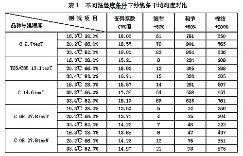 就一般測試條件而言,造成這種變化的原因可能還有其它方面的因素,如紗線不同片段間的離散性,由于被測紗線不能重復(fù)測試,各溫濕度條件下試驗(yàn)的紗線片段間可能有差異,但不同片斷間本身的條干均勻度差異不會形成如此顯著的變化;另一方面是由不同測試人員在不同的儀器上測試,如今的條干均勻度測試儀和測試操作,經(jīng)過多年的不斷發(fā)展和完善,儀器狀態(tài)已趨于穩(wěn)定,操作已基本趨于規(guī)范。故以上兩因素造成條干均勻度測試明顯誤差的可能基本排除,因此而言,溫濕度是造成條干均勻度測試結(jié)果明顯差異的主要因素。