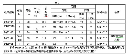絡(luò)低支竹節(jié)棉紗時,清紗器門限參數(shù)的設(shè)定中不關(guān)閉長粗節(jié)、是根據(jù)特長粗、長粗的長短來確定紗疵的門限和長度,具體的設(shè)定參數(shù)見表1。