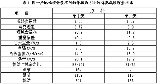 短絨對成紗質量的影響在于紡紗過程中短絨難以徹底清除和控制。雖然在清花工序、梳棉工序部分短絨隨同雜質一同落下,但仍有相當一部分短絨成為生條中的一部分,大部分短絨在并條工序、粗紗工序、細紗工序的牽伸過程中,不被羅拉所握持,呈游離纖維,從而引起“牽伸波”,造成紗的粗節(jié)、細節(jié),從而使成紗條干不勻,造成紗線斷頭增加,紗線強力下降等。表1為同一產地,成熟度接近的等級為329的棉花,當短絨含量不同時,通過單嘜試紡27.8tex紗,得到不同的成紗質量。