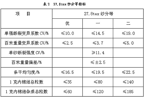 GB/T 398-1993《棉本色紗線》規(guī)定:1)棉紗線的品等分為優(yōu)等、一等、二等,低于二等指標者視為三等;2)棉紗的品等由單紗的斷裂強力變異系數CV(%)、百米重量變異系數CV(%)、條干均勻度CV(%)、1克內棉結粒數及1克內棉結雜質總粒數評定;3)單紗(線)的斷裂強度或百米重量偏差超出允許范圍時,在單紗(線)斷裂強力變異系數CV(%)和百米重量變異系數CV(%)原評等的基礎上作順降一個等級處理,降至二等為止。表2為GB/T 398-1993《棉本色紗線》普梳27.8tex紗的評等技術條件。