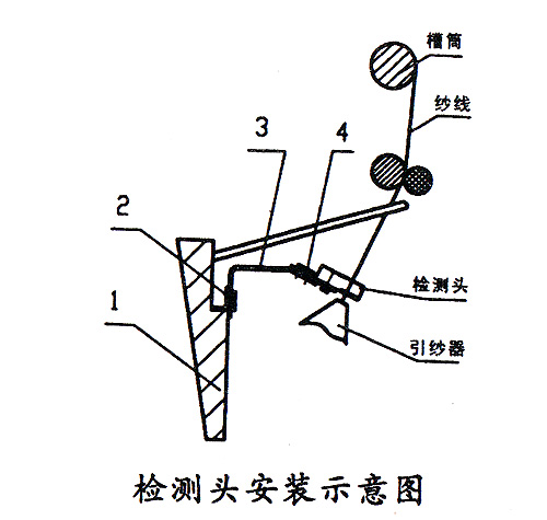 其中“2”可左右調(diào)節(jié);“3”可左右調(diào)節(jié);“4”可左右及前后調(diào)節(jié),每隔4錠就有一個(gè)“1”上的螺栓將支架可靠固定在紡紗機(jī)的機(jī)架上,確保紗線在檢測區(qū)的中間部位,這對清除有害紗疵的準(zhǔn)確率起到很好的作用。