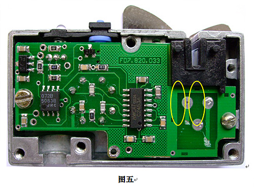 2.1.3 調(diào)整檢測頭零點的方法,是通過割檢測頭印制板上的印制線,見圖五圈中所示,割左邊的印制線會使零點朝正零點方向調(diào)整;割右邊的印制線會使零點朝負方向調(diào)整。