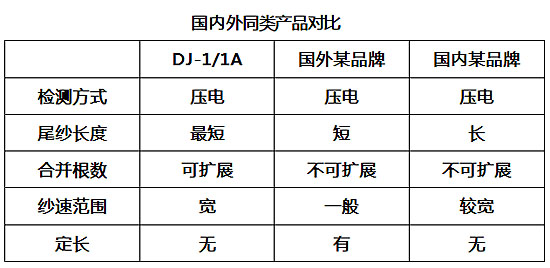目前,國外較先進的并紗機斷紗檢測器的主要優(yōu)點是:壓電式測量,采用微處理技術(shù),性能好,可靠性高,并紗支數(shù)可達120Nec,分級處理,但價格昂貴。國產(chǎn)壓電式斷紗檢測器,處理器采用數(shù)字式硬件方式,最高并紗支數(shù)可達134Nec,但可靠性低,并紗根數(shù)錠數(shù)配置固定,不易擴展。長嶺紡電DJ-1/1A斷紗檢測器的主要性能指標均處于優(yōu)先水平,某些項目 達到或超過了國際先進水平。 下表列出了國內(nèi)外的斷紗檢測器對比情況。