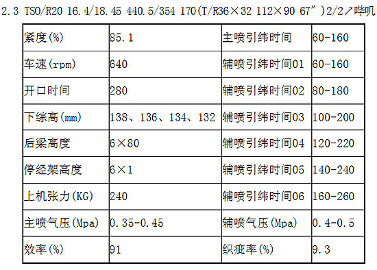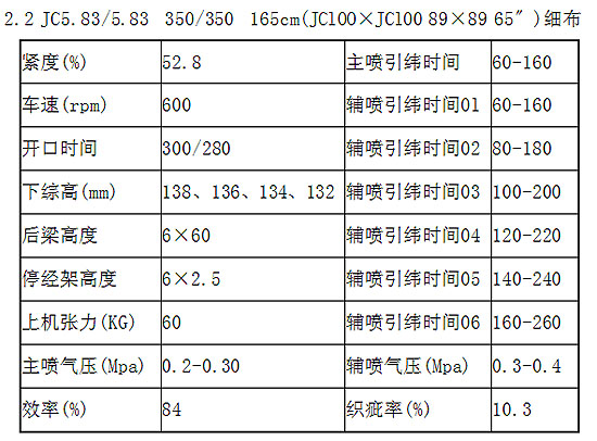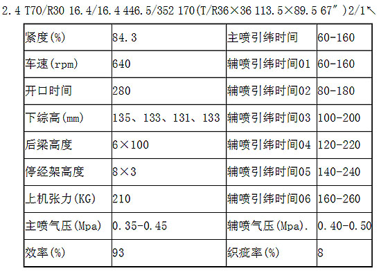 2011年4月8日我公司安裝了8臺陜西長嶺紡織機(jī)電科技有限公司生產(chǎn)的CA082-190-2C-ZC4-E型噴氣織機(jī),在生產(chǎn)運行期間,我公司的工程技術(shù)人員對該機(jī)型的性能特點、工藝性及品種的適應(yīng)性進(jìn)行了生產(chǎn)運行測試,先后在該機(jī)型上生產(chǎn)了滌粘嗶嘰、高支粘膠、精梳純棉系列從稀薄到較厚重等織物品種,該機(jī)型有較高的品種適應(yīng)性,并且運行穩(wěn)定。
