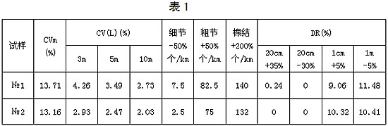 取半精梳CJ/C18.5tex管紗做基紗串接兩段半精梳CJ/C22.7tex細(xì)紗構(gòu)成長約5.5m粗約+23%的兩個異常粗節(jié)進(jìn)行模擬試驗。№1為串接兩異常粗節(jié)的試樣,№2為同一管紗的正常試樣,兩試樣長度皆為400m。測得有關(guān)數(shù)據(jù)見表1,№.1試樣的線密度不勻曲線及№1、№2兩試樣的DR曲線見圖1。