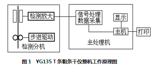 CT500T條粗條干儀由檢測分機、主處理機(包括顯示器、鍵盤、鼠標)、打印機及成套附件組成。整機工作原理框圖見圖1。