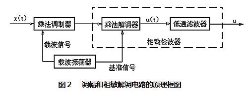 如果平行極板間有紗條通過,其介質(zhì)的相對介電常數(shù)就發(fā)生變化,也就是說電容量發(fā)生了變化,電容量的每一細小變化都反映出了紗條不勻的變化,由于電容量變化是微小的,后面還需乘法器處理,對于多數(shù)被測信號來說,都是有符號(或方向)變化的,所以需要用乘法器中的相敏檢波電路把調(diào)制波的振幅和相位變化同時解調(diào)出來。圖2為調(diào)幅和相敏解調(diào)電路的原理框圖,其中虛線框內(nèi)為相敏檢波器的原理框圖。