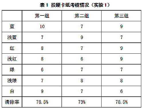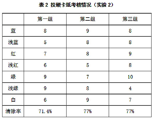 CS808棉花異纖清除機(jī)目前在某廠家做實(shí)驗(yàn)使用5個(gè)多月,現(xiàn)場產(chǎn)線為圓盤機(jī) ,開松效果不如清梳聯(lián),并且每天檢測的棉花品種都不同,且差異較大,因此根據(jù)現(xiàn)場情況創(chuàng)建多個(gè)分類器,不同的分類器設(shè)置不同的算法參數(shù),滿足配棉頻繁變化的需求。投擲樣本為硬卡紙,長度為 40mm×2.0mm的七種紙條(紅、綠、藍(lán)、淺紅、淺綠、淺藍(lán)、白色熒光)混合后,在距離檢測通道前正中間開一個(gè)8mm小孔,在棉花通過檢測區(qū)域時(shí),在該小孔投放樣本,投放完畢后從廢棉中檢出投放樣本,試驗(yàn)結(jié)果如表1和表2所示。
