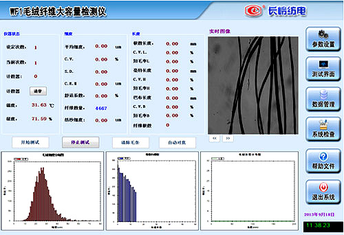 長度和細(xì)度指標(biāo)是表征羊毛等毛絨纖維物理性能的重要指標(biāo),對毛紡生產(chǎn)過程和產(chǎn)品質(zhì)量影響很大。目前國內(nèi)測量毛絨纖維長度的方法主要為梳片法,它只能測量出巴布長度和間接毫特長度等指標(biāo),且試驗時間長,計算工作量大;測量細(xì)度的儀器主要是投影顯微鏡,盡管這幾年來此類產(chǎn)品的精度和自動化程度有所提高,但測試效率還仍然偏低。長嶺WF1毛絨纖維大容量檢測儀采用光學(xué)圖像分析法,可以同時測量毛絨纖維的長度和細(xì)度指標(biāo),并且能同時給出根數(shù)長度、毫特長度、巴布長度等各項長度指標(biāo),尤其是根數(shù)加權(quán)長度指標(biāo)的快速測試,由于使用的是光學(xué)鏡頭配合數(shù)字相機,所以其測量結(jié)果精確,測試效率很高??梢宰鳛槊q纖維質(zhì)量快速檢測與評價的儀器。