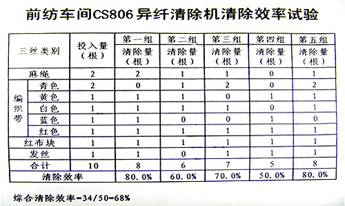 分析清除效率,設(shè)備正常生產(chǎn)中,在異纖機(jī)前級(jí)開棉機(jī)出口投入標(biāo)準(zhǔn)考核異纖樣本,從廢棉中撿出的樣本與樣本總投入數(shù)量的比值。