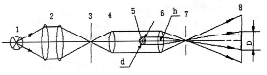 光電式條干測量是在紗線快速通過檢測區(qū)且紗線本身有抖動的狀態(tài)下進(jìn)行的非接觸瞬時(shí)測量,所以測量的光學(xué)系統(tǒng)應(yīng)是一個(gè)遠(yuǎn)心光路系統(tǒng)。其原理如圖2所示,光源1經(jīng)過聚光透鏡2聚焦于光欄3,由準(zhǔn)直物鏡4形成準(zhǔn)直光束,對紗線5作背景照明,再經(jīng)投影物鏡6在光電接收器靶面上形成放大的陰影像D,對這個(gè)陰影像進(jìn)行測量,可達(dá)到紗線直徑測量之目的,此方法也稱投影放大法。在光學(xué)上,紗線直徑測量可用下式表達(dá):