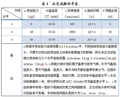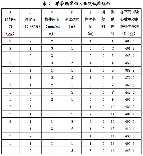 以上測(cè)試參數(shù)均對(duì)單紗斷裂強(qiáng)力測(cè)試偏離產(chǎn)生影響,這些因素對(duì)單紗斷裂強(qiáng)力的影響各不相同。為科學(xué)、準(zhǔn)確、嚴(yán)謹(jǐn)?shù)乜刂聘鳒y(cè)試參數(shù),減少測(cè)量不確定度,我們應(yīng)用正交試驗(yàn),對(duì)單紗斷裂強(qiáng)力各測(cè)試參數(shù)進(jìn)行分析比較,依據(jù)不同參數(shù)對(duì)測(cè)試結(jié)果的不同影響設(shè)置測(cè)試參數(shù),以此提高單紗斷裂強(qiáng)力準(zhǔn)確性和可靠性。