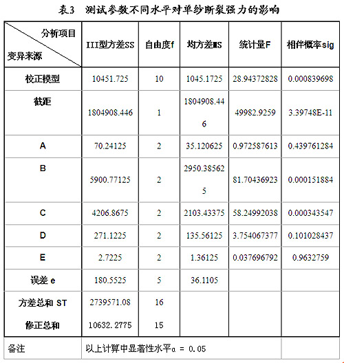 由F分布給出的因子A、因子D、 因子E相伴概率均大于0.05,說明三因子在顯著性水平ɑ = 0.05上與上對(duì)測(cè)試結(jié)果的影響勻不顯著,并且其中因子A、因子E均小于誤差e=180.5525,是影響單紗斷裂強(qiáng)力各參數(shù)中最小的兩個(gè)因子。以上三因子對(duì)于單紗斷裂強(qiáng)力的貢獻(xiàn)大小,與樣本本身的離散性大小直接相關(guān),本案例預(yù)加張力小于測(cè)試次數(shù)的III型方差,或緣于這個(gè)樣本的離散性。