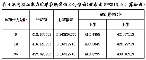 標(biāo)準(zhǔn)規(guī)定的單紗斷裂強(qiáng)力施加0.5±0.1cN/tex,對(duì)于一個(gè)測(cè)試樣品而言,標(biāo)準(zhǔn)給出的不是一個(gè)確定值,而是一個(gè)可以選擇的范圍。按照標(biāo)準(zhǔn)規(guī)定的預(yù)加張力,它可以施加0.5cN/tex的預(yù)加張力,也可以施加0.4cN/tex、0.6cN/tex的預(yù)加張力。通過正交試驗(yàn)可以看出,不同的預(yù)加張力對(duì)單紗斷裂強(qiáng)力產(chǎn)生不同的影響,見表3,同一個(gè)樣品因預(yù)加張力的選擇不同由此產(chǎn)生測(cè)量不確定度,這也成為不同試驗(yàn)室測(cè)試同一樣品測(cè)試結(jié)果不一致的原因之一。不同預(yù)加張力對(duì)單紗斷裂強(qiáng)力的影響見4。