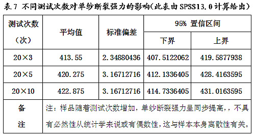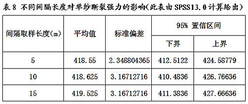 采用不同的管紗數(shù)量與不同的測(cè)試次數(shù),及不同測(cè)試次數(shù)間隔長度不同,關(guān)系到樣本采用與利用的程度,關(guān)系到測(cè)試信息的是否充分,這些都會(huì)賦予單紗斷裂強(qiáng)力測(cè)試的測(cè)量不確定度,影響到對(duì)于一批紗線產(chǎn)品評(píng)估的準(zhǔn)確性和可靠性。測(cè)試次數(shù)與間隔長度不同對(duì)單紗斷裂強(qiáng)力的影響到見表7、表8。