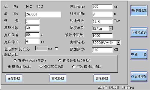2.將管紗通過紗架引紗到主機換紗架上之后,即可開始測試。在開始測試之前,應(yīng)在觸摸屏參數(shù)設(shè)置界面上設(shè)置相關(guān)參數(shù)。
