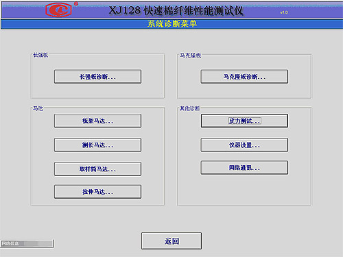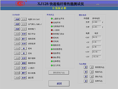 在XJ128正常待機(jī)的情況下,進(jìn)入“XJ128快速棉纖維測(cè)試儀”執(zhí)行軟件,在主菜單上點(diǎn)擊“系統(tǒng)診斷”按鈕,可進(jìn)入系統(tǒng)診斷菜單界面;點(diǎn)擊“長強(qiáng)板診斷…”按鈕,即可進(jìn)入長強(qiáng)板診斷界面。
