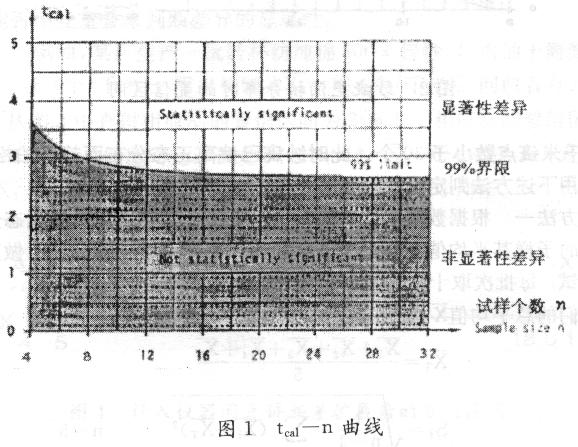 查圖1所給的tcal—n曲線,相應(yīng)式樣個數(shù)n=10時分界線上的t值為2.8 (可信度99%),現(xiàn)計算所得的tcal<2.8即位于陰影區(qū)內(nèi),說明上述對千米棉結(jié)數(shù)的兩測試結(jié)果不存在顯著性差異。