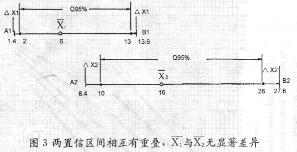 顯然此時的置信區(qū)間對均值而言是不對稱的。A1B1與A2B2兩線段能夠相互重疊,可判定上述兩測試結(jié)果X1與X2沒有顯著差異。
