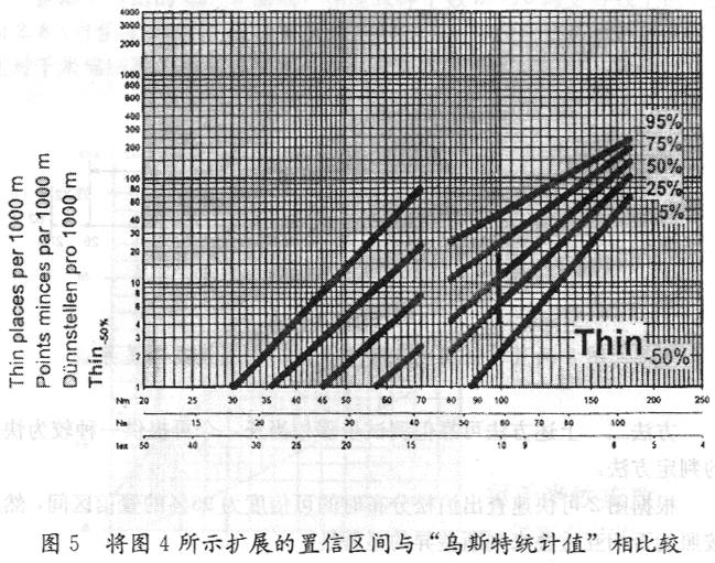 將圖4所示擴(kuò)展后的置信區(qū)間繪入2001年版“烏斯特統(tǒng)計值”中相應(yīng)于10tex的垂直位置上(見圖5),上、下兩端分別對應(yīng)千米細(xì)節(jié)數(shù)4及19.5。其表示該批紗線的細(xì)節(jié)(-50%)約位于“烏斯特統(tǒng)計值”的18%和70%之間,說明這批紗線的細(xì)節(jié)比占世界產(chǎn)量18%的紗的質(zhì)量為差,而比占世界產(chǎn)量30%的紗要好,從圖5中可看出屬中等偏上水平。