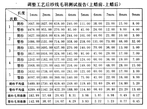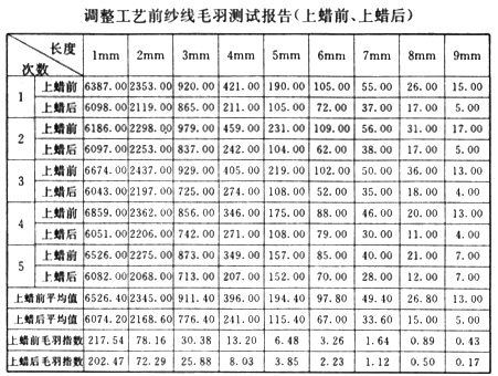 通過以上數(shù)據(jù)對比不難看出上蠟后毛羽數(shù)量少于上蠟前,降速后毛羽數(shù)量少于降速前,這樣我們就可以在實際生產(chǎn)中根據(jù)客戶對毛羽指標的不同要求來適當調整工藝。